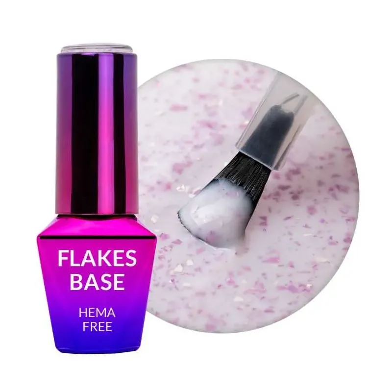 La Base coat ibrida Rubber Flakes Base è una base semipermanente bianco lattiginoso con scaglie viola che grazie alla sua formula innovativa può essere utilizzata anche per piccoli allungamenti e lievi bombature.