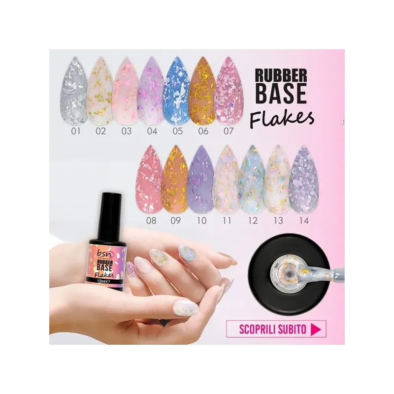 Flakes base gel BSN è una base rubber autolivellante in un comodo flacone con pennellino.