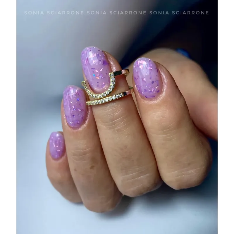 La base rubber Flakes BSN colorazione 010 è una base color lilla con all'interno delle scaglie di alluminio flakes rosa, grazie alla sua formula innovativa può essere utilizzata anche per piccoli allungamenti e lievi bombature.