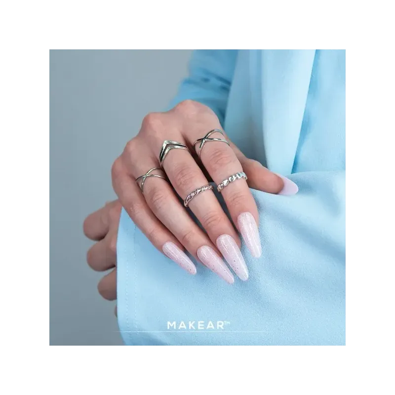 Il gel uv champagne Glitter Ice Pink Makear ha una densità alta ma comunque autolivellante infatti è consigliato per la tecnica senza limatura nofile; grazie alla sua alta densità non cola, ed è possibile lavorare fino a 2 unghie alla volta.