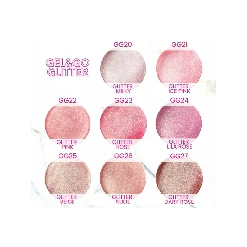 Il gel Gel&go glitter Makear è disponibile in 8 colorazioni: GG20 GLITTER MILKY; GG21 GLITTER ICE PINK; GG22 GLITTER PINK; GG23 GLITTER ROSE; GG24 GLITTER LILA ROSE; GG25 GLITTER BEIGE; GG26 GLITTER NUDE; GG27 GLITTER DARK ROSE.