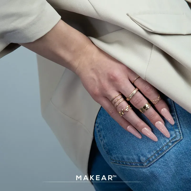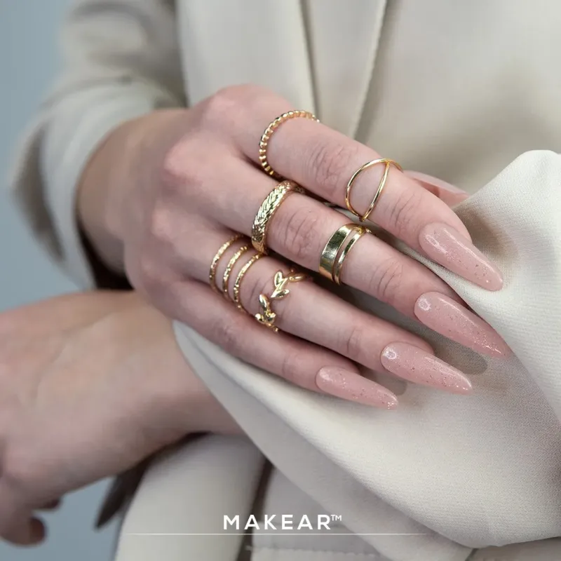 Il gel uv champagne Glitter nude Makear ha una densità alta ma comunque autolivellante infatti è consigliato per la tecnica senza limatura nofile; grazie alla sua alta densità non cola, ed è possibile lavorare fino a 2 unghie alla volta.