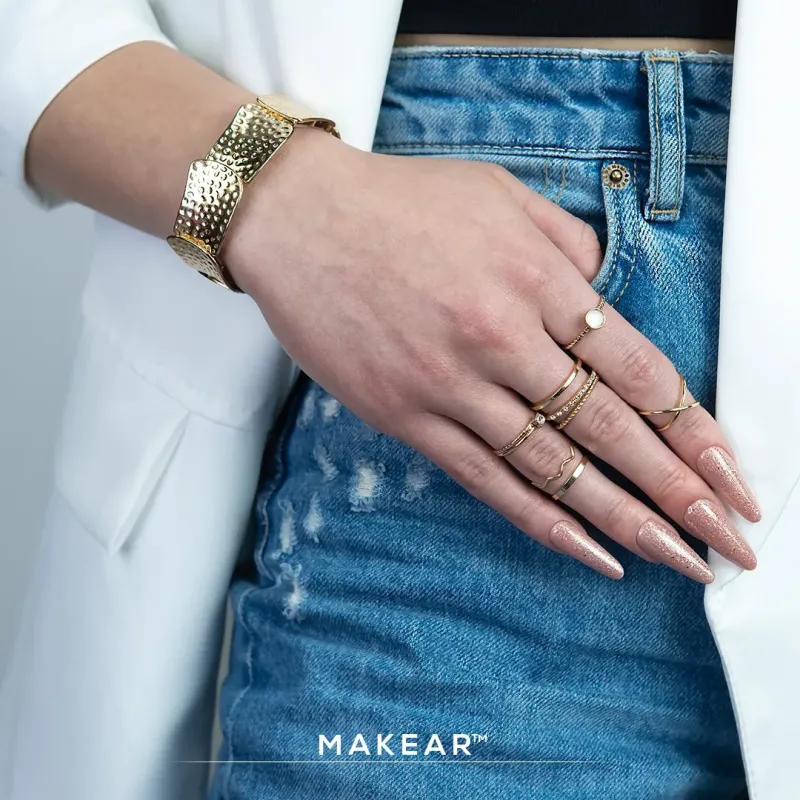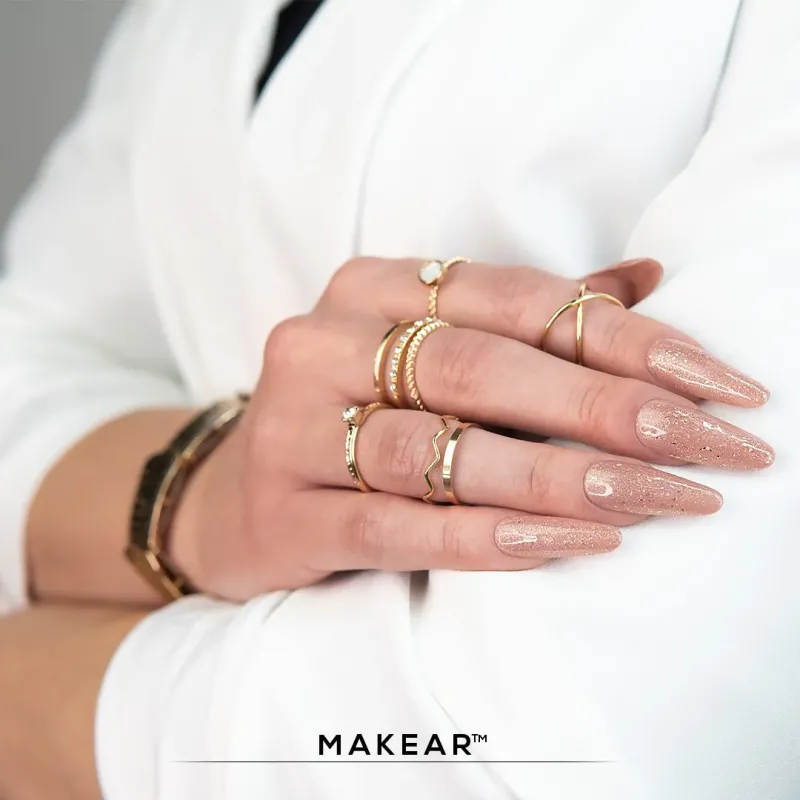 Il gel uv champagne Glitter Dark rose Makear ha una densità alta ma comunque autolivellante infatti è consigliato per la tecnica senza limatura nofile; grazie alla sua alta densità non cola, ed è possibile lavorare fino a 2 unghie alla volta.