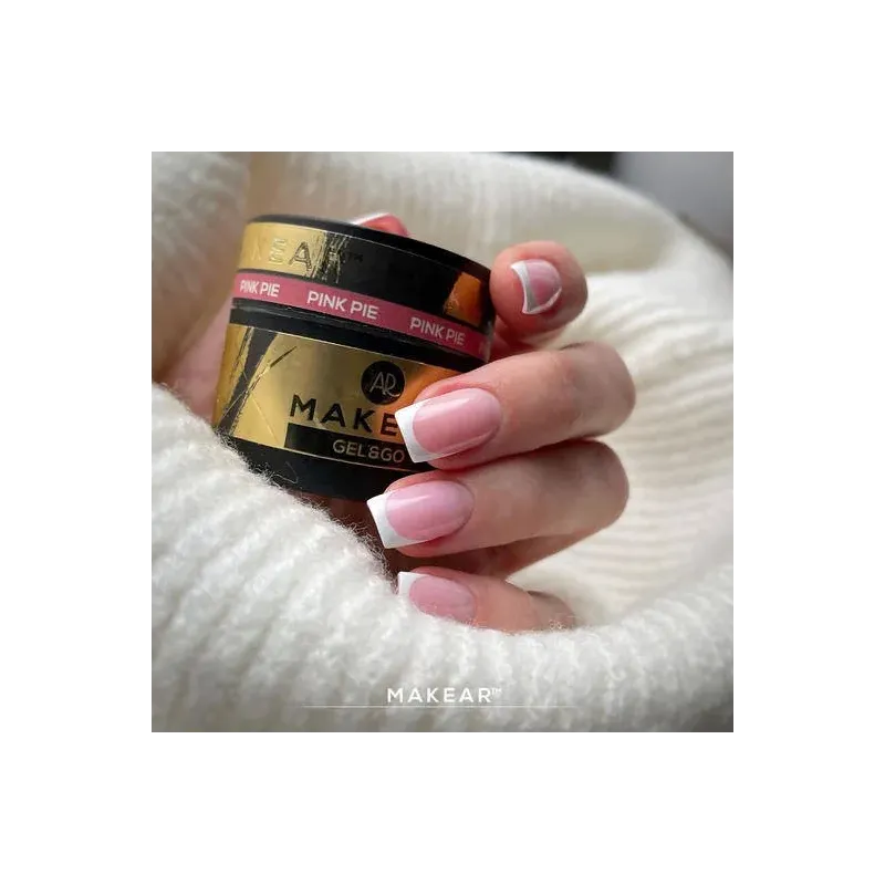 La colorazione del gel Makear è stato studiata per coprire le imperfezioni come discromie e macchie dell'unghia o lo scalino della tip. Il Pink Pie white Gel&go è un gel costruttore color rosa con una coprenza del 100% adatto a creare french manicure in superfice, sconsigliato per la tecnica muretto in quanto più morbido degli altri cover.