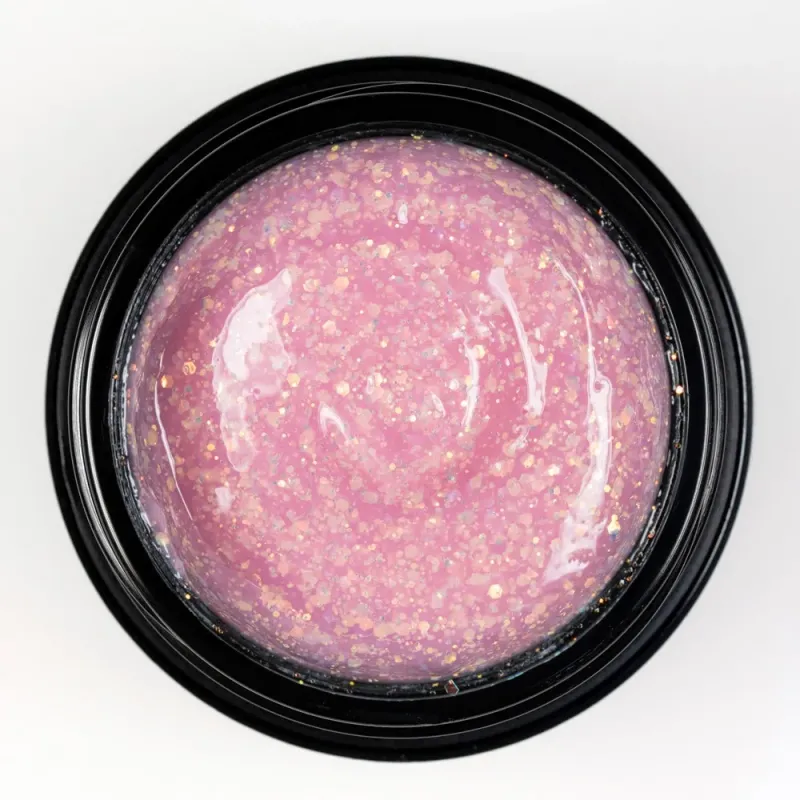 Gel uvled costruttore monofasico, linea CREAM GLAM, geluv glitterato Fairy Goodies è un cover coprente adatto alla tecnica muretto, è tissotropico molto autolivellante, densità altissima ma morbido, adatto a tutte le stagioni, colore rosa con glitter oro, 30gr