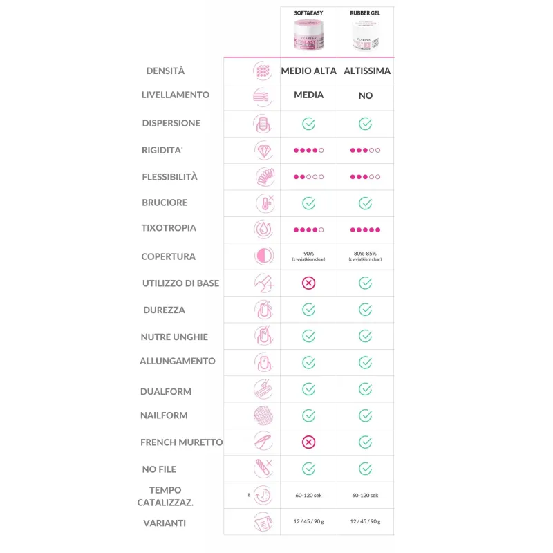 SOFT&EASY GEL è disponibile in 16 colori: SKIN COVER nude naturale e neutro, LILAC lilla pastello, BLUSH PINK rosa scuro, GLIMMER PINK rosa pastello con flakes iridescenti, CLEAR trasparente, NATURAL cover nude naturale e delicato, MILKY PINK rosa lattiginoso, BABY PINK rosa confetto, CHAMPAGNE beige con particelle dorate scintillanti, GLAM PINK rosa pastello con particelle d'argento scintillanti, PINK CHAMPAGNE delicato rosa chiarissimo con pigmenti rosa, GOLD PROSECCO beige chiaro con pigmenti d'oro, MILKY WHITE bianco latte, PANNA COTTA rosa molto chiaro quasi bianco, SWEET SUGAR rosa quasi bianco con pigmento rosa, LIGHT BEIGE beige chiaro e caldo.
