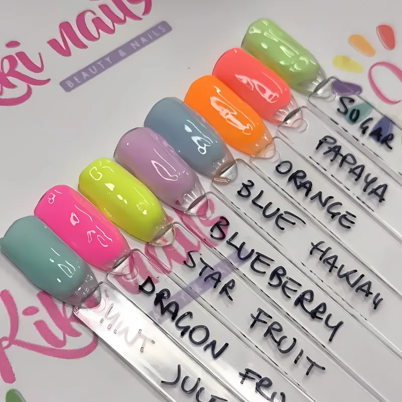 Il gel tissotropico TROPICAL SUMMER Beauty Space Nails è disponibile in 9 colori: Orange juice arancione fluo, Dragon fruit rosa fluo, Papaya corallo fluo, Star fruit giallo fluo, Mint Julep verde acqua, Fruit Punch rosa barbie, Blueberry Lemonade lilla, Sugar apple verde mela, Blue Hawaii azzurro pastello.