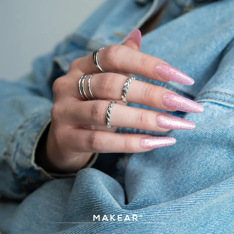 Il gel uv champagne Glitter rose Makear ha una densità alta ma comunque autolivellante infatti è consigliato per la tecnica senza limatura nofile; grazie alla sua alta densità non cola, ed è possibile lavorare fino a 2 unghie alla volta.