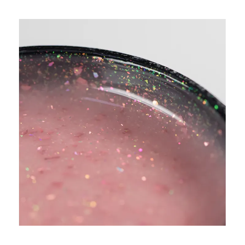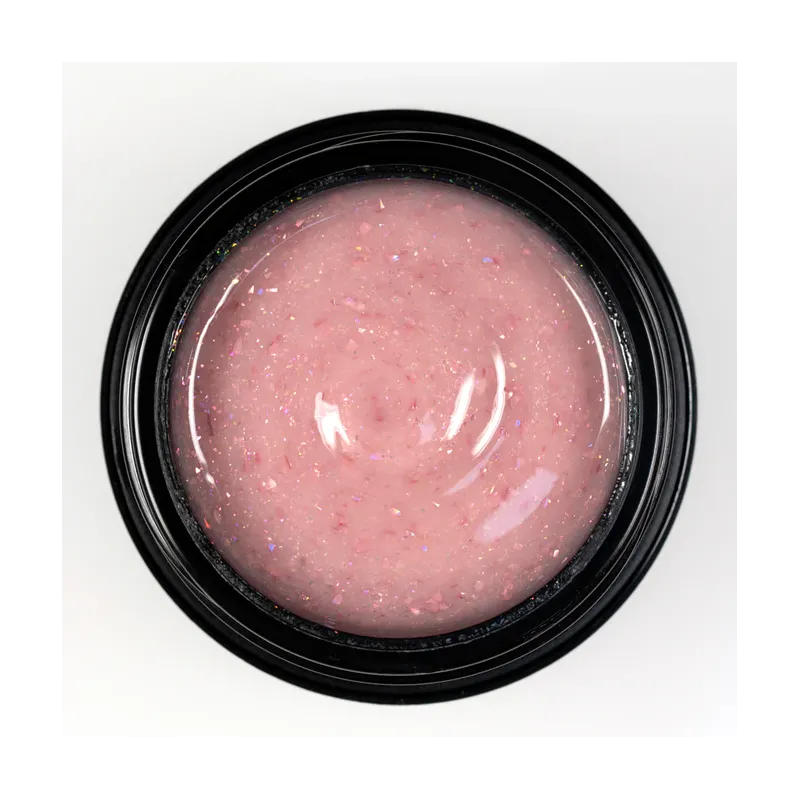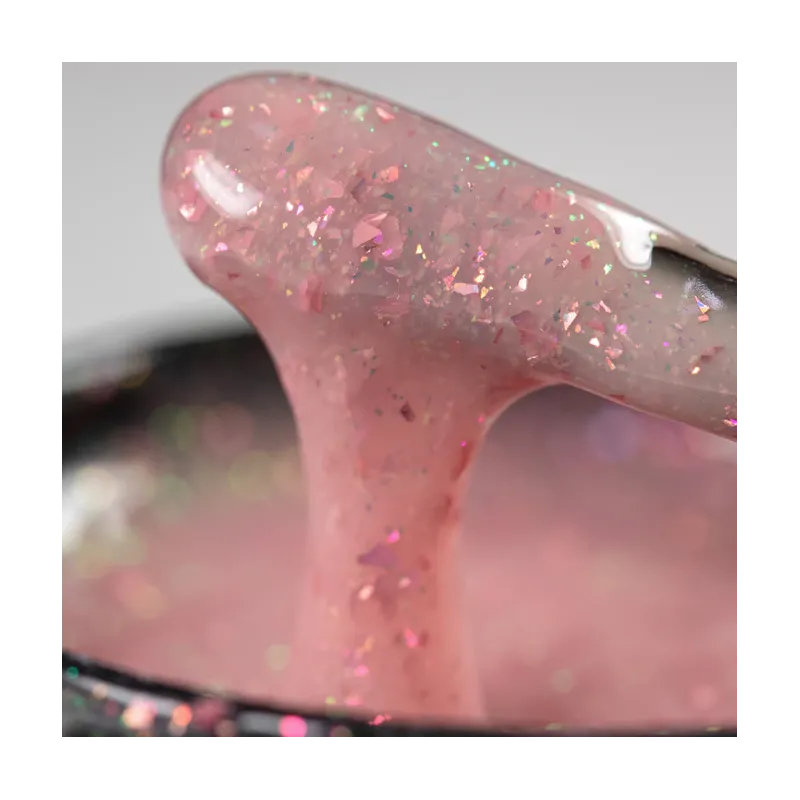 Gel uvled costruttore monofasico, linea CREAM GLAM, geluv glitterato Milkshake Sugar rose è un cover coprente adatto alla tecnica muretto, è tissotropico molto autolivellante, densità altissima ma morbido, adatto a tutte le stagioni, colore nude chiaro con pigmento fuxia e flakes fuxia, 30gr