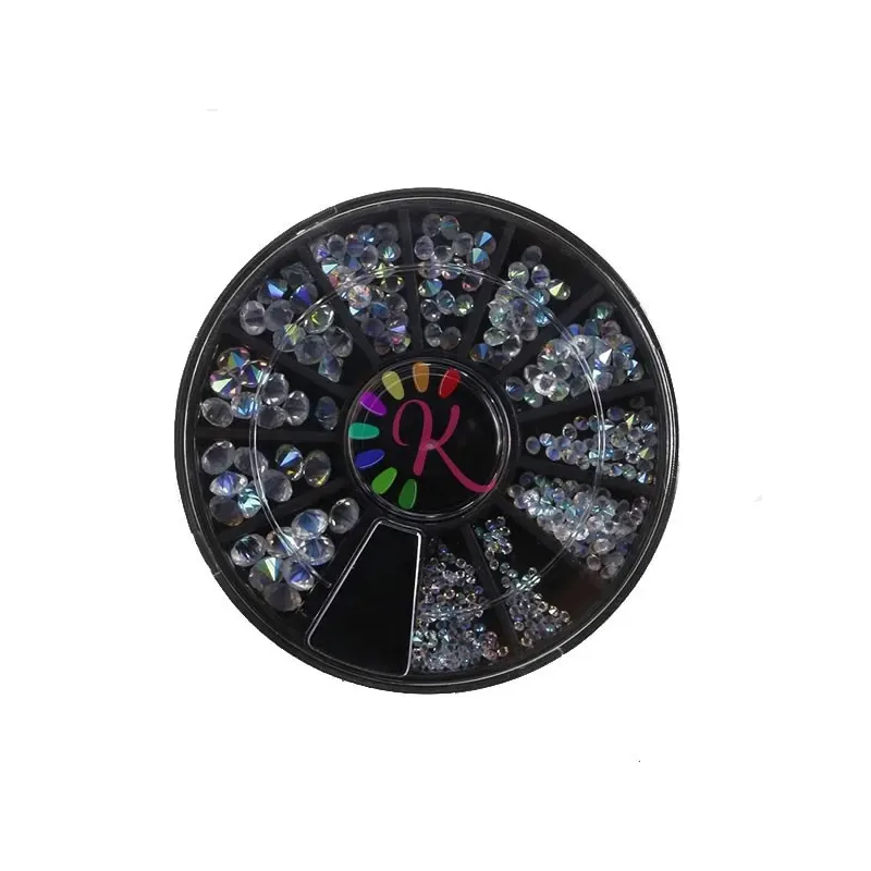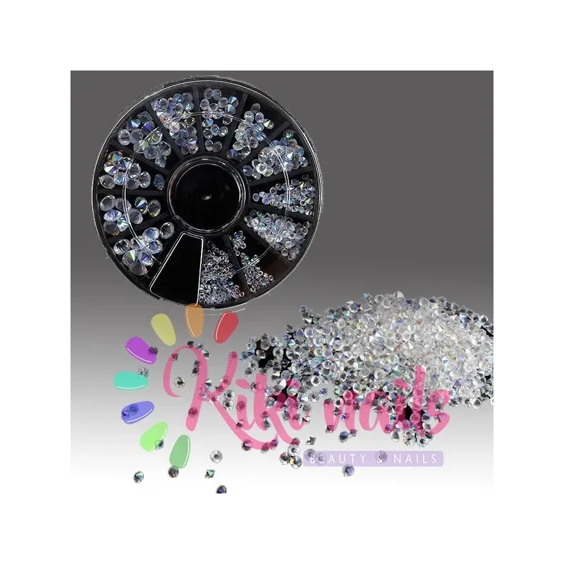 La ruota decorazione Crystal pixie contiene swarowsky intagliati in maniera particolare, alcuni con il fondo piatto altri sono veri e propri diamanti in miniatura. Nella ruota nail ci sono circa 150 pezzi dcon riflessi boreali di varie misure: da ss2 a ss10.