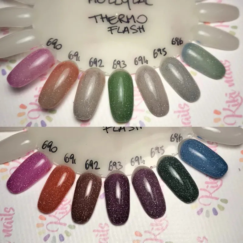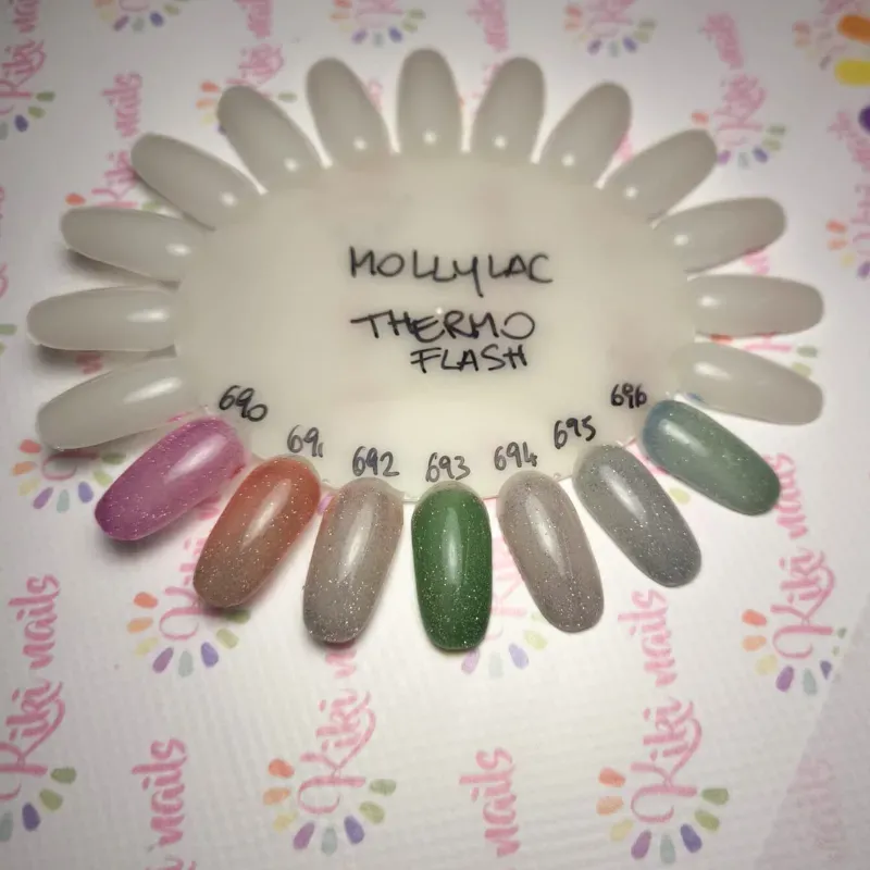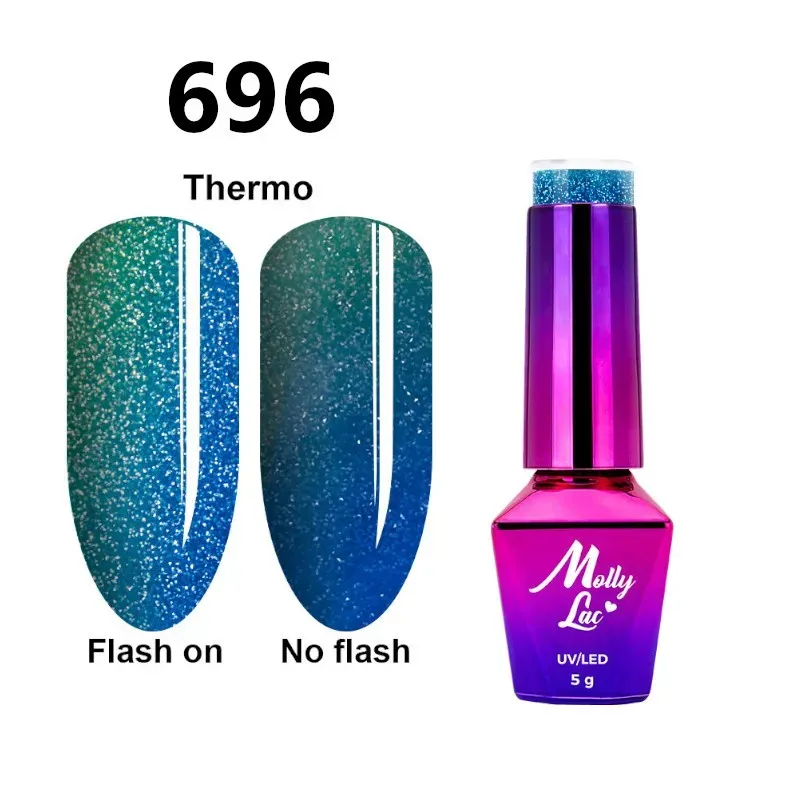 Semipermanente Allepaznokcie linea MOLLYLAC FLASHING THERMO, 5 ml, densità media, coprente in una passata, è la nuova linea trend estate 2023! La linea è caratterizzata da microparticelle riflettenti che con la luce brillano più che mai e dall'effetto thermo che cambia colore con la temperatura.