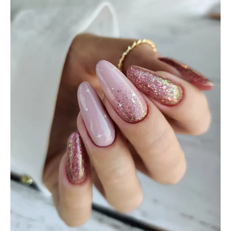I glitter e le polveri all'interno dei colori sono di diverso tipo, più sottili o più spesse, tinta unita o holo, paillette romboidali o maxi glitter. Consigliamo di osservare le foto nella galleria o il video a fondo pagina per capire al meglio la nuance e il luccichio del colore.
