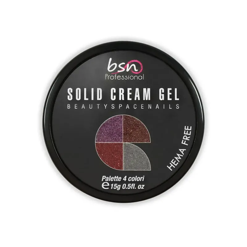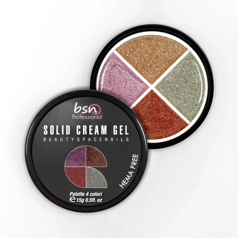 Il solid cream o anche detto solid pudding gel o Japanese gel o cream è un gel comodo e funzionale ed estremamente pratico, la consistenza è più cremosa e la stesura è più facile e veloce dei normali gel color, non lasciano striature e sono setosi e facilissimi da sfumare tra di loro.