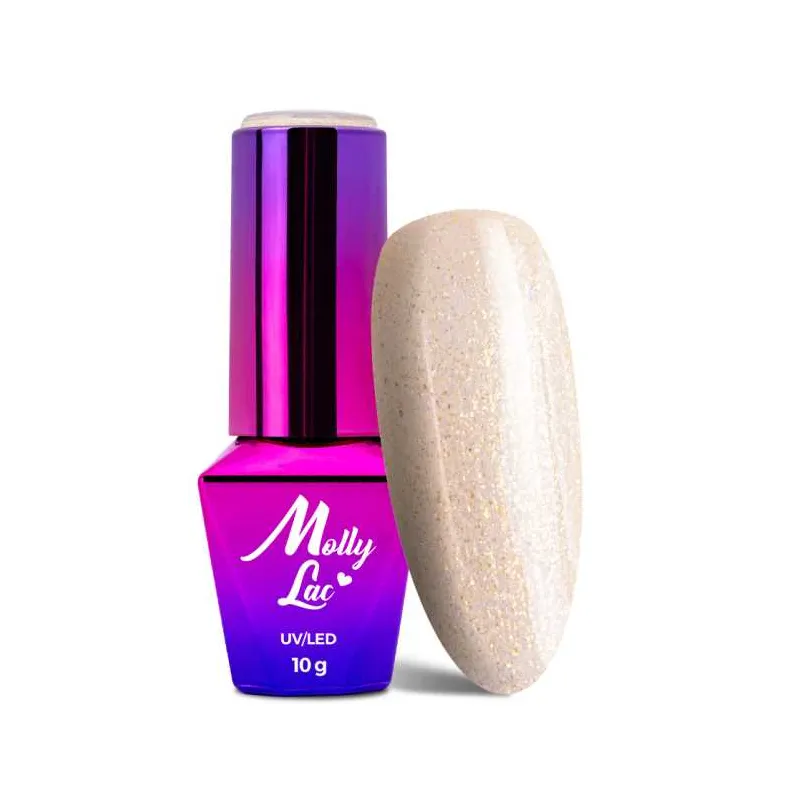 Semipermanente MOLLYLAC linea WEDDING DREAM CHAMPAGNE, 10gr, densità media, coprente in una passata. La linea è caratterizzata da 9 colori frizzanti i cui nomi sono ispirati al brindisi: glitter su sfondi tenui e più carichi, per spose e invitate perfette.