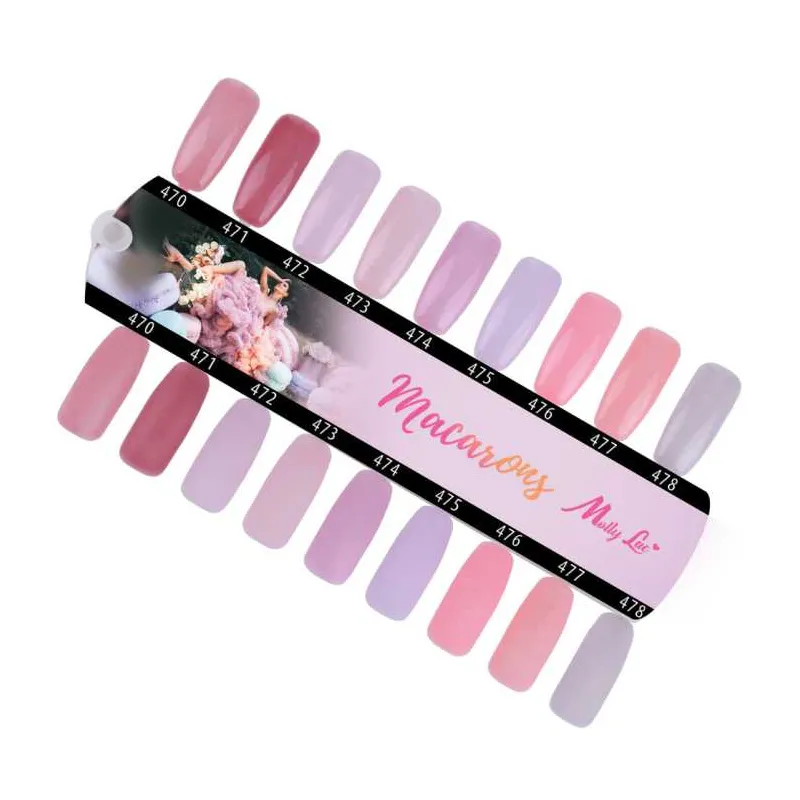 Semipermanente MOLLYLAC linea MACARONS, 10gr, densità media, coprente in una passata. La linea è caratterizzata da 9 colori rosati e semitrasparenti ispirati alla golosità dei dolci: splendidi glitter arricchiscono queste nuances adatte al babyboomer, alla french manicure o ad accompagnare colori grintosi.