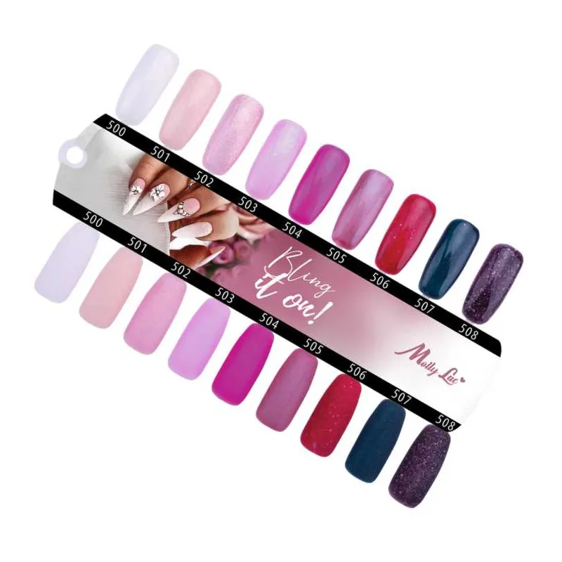 Semipermanente MOLLYLAC linea BLING IT ON!, 10gr, densità media, coprente in una passata. La linea è caratterizzata da 9 colori che spaziano dal rosa al verde passando per il viola, iperfemminili e sofisticati, tutti corredati da glitter.