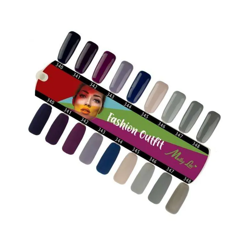 Semipermanente MOLLYLAC linea FASHION OUTFIT, 10gr, densità media, coprente in una passata. Le 9 tonalità della collezione racchiudono un ampio spettro di femminilità: l'intensità del viola, l'eleganza dei grigi; colori stupendi e pieni per manicure autunnali e invernali.
