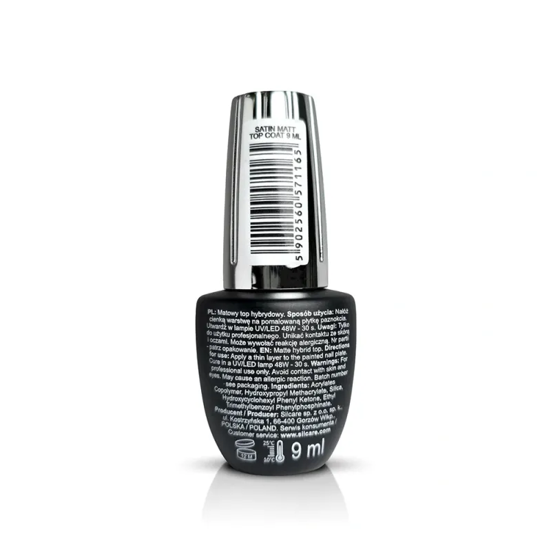 L'Hibrid semipermanente Top Matt è un lucido senza dispersione studiato appositamente per creare un effetto satinato/vellutato (morbido al tatto) che steso sopra qualsiasi colore rende l’effetto anzichè lucido, opaco velvet. L'effetto satinato matt è molto delicato e tende a macchiarsi e/o graffiarsi.