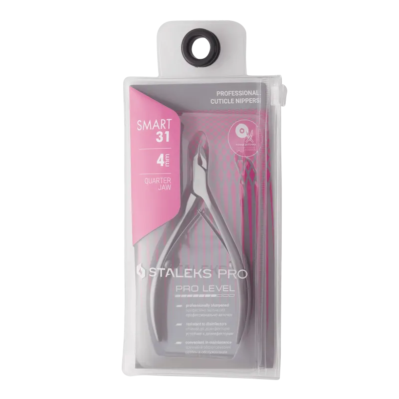 Il tronchesino per cuticole Staleks Pro modello SMART 31 4mm ha un'impugnatura curva classica con molla interna che riapre in automatico le lame.